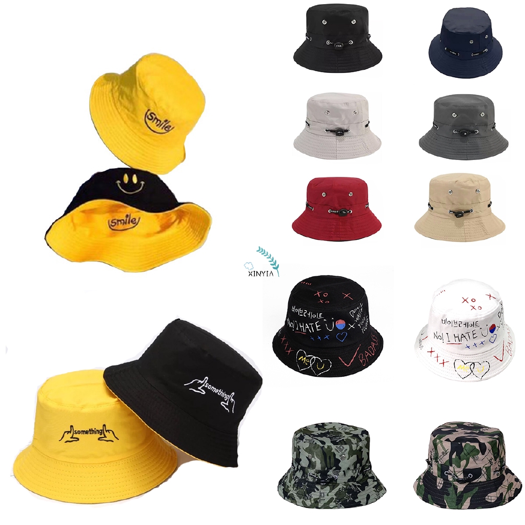 Korea Dua Sisi Bolak Balik Topi Bucket Fisherman Lipat Motif Print Tulisan Topi Bucket Pria Shopee Indonesia